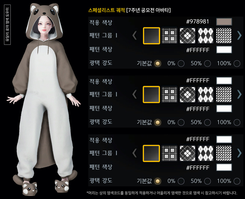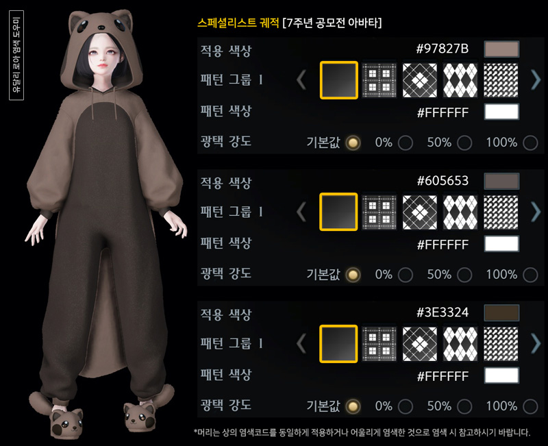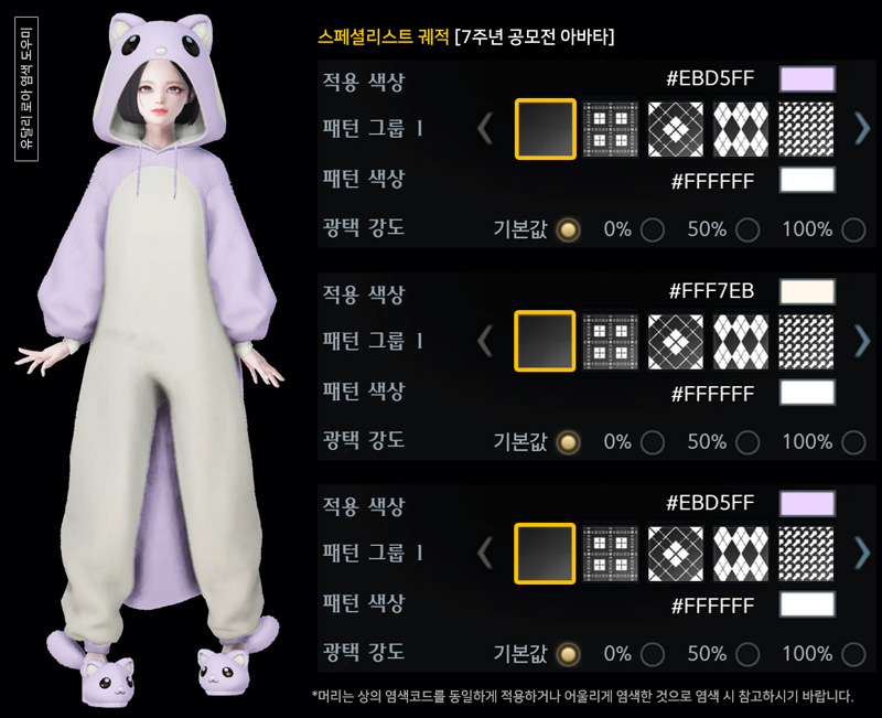 촬영 시 대륙 조명에 따라 아바타에 적용된 염색, 패턴, 광택이 다르게 보일 수 있으니 참고 바랍니다.