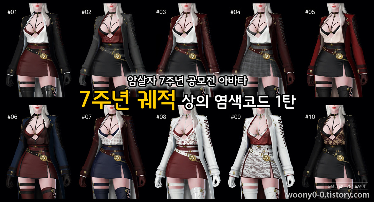 7주년 암살자 궤적 아바타 염색코드 4탄안녕하세요. 유달리입니다.오늘은 암살자 7주년 궤적 아바타 염색코드 마지막으로 4탄입니다. 1탄 검붉은색, 2탄 갈색, 3탄 파란색 계열을 준비했다면이번