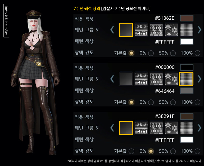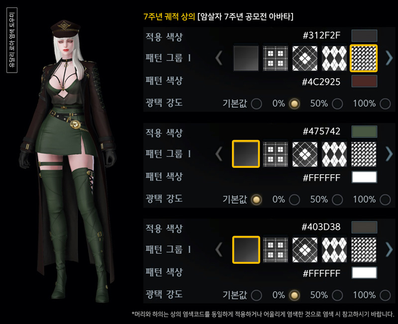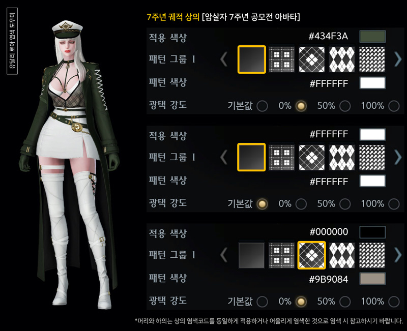 7주년 암살자 궤적 아바타 염색코드 4탄안녕하세요. 유달리입니다.오늘은 암살자 7주년 궤적 아바타 염색코드 마지막으로 4탄입니다. 1탄 검붉은색, 2탄 갈색, 3탄 파란색 계열을 준비했다면이번