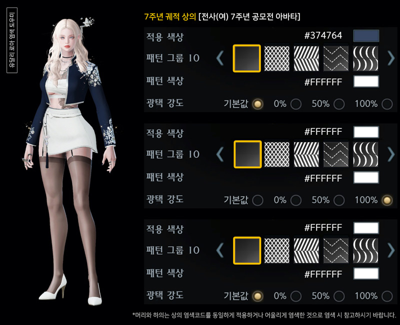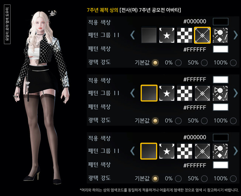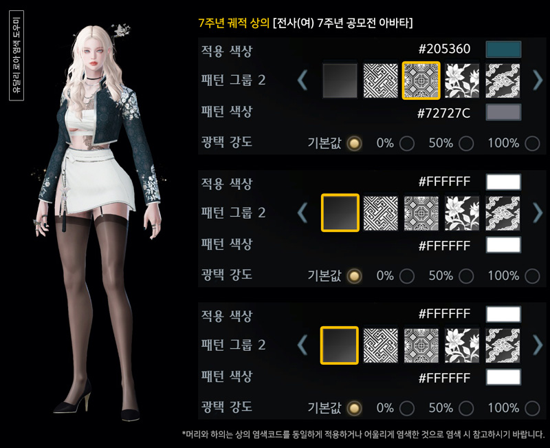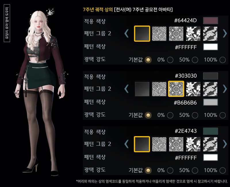오늘은 여자 전사(슬레이어, 발키리) 7주년 궤적 아바타 염색코드 2탄을 준비했습니다.