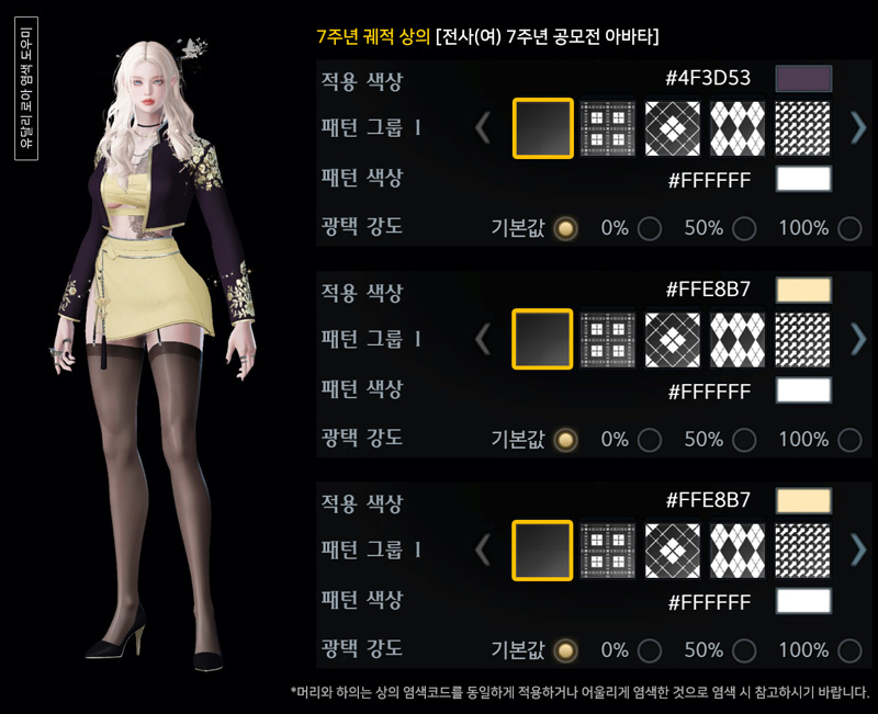 오늘은 여자 전사(슬레이어, 발키리) 7주년 궤적 아바타 염색코드 3탄입니다.