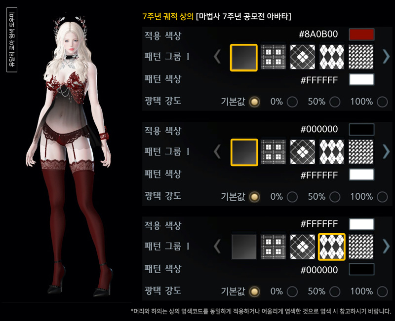 촬영 시 대륙 조명에 따라 아바타에 적용된 염색, 패턴, 광택이 다르게 보일 수 있으니 참고 바랍니다.