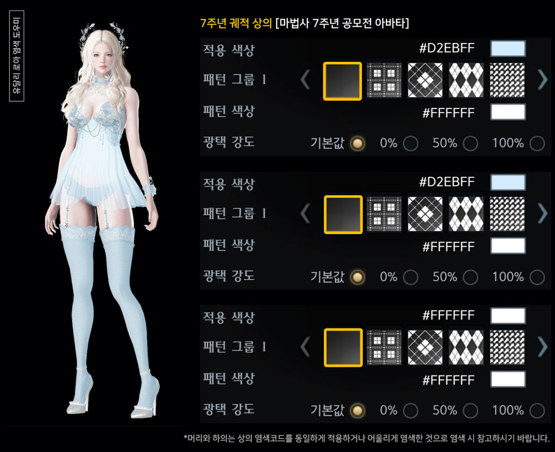 촬영 시 대륙 조명에 따라 아바타에 적용된 염색, 패턴, 광택이 다르게 보일 수 있으니 참고 바랍니다.