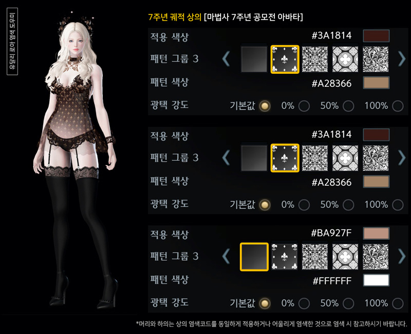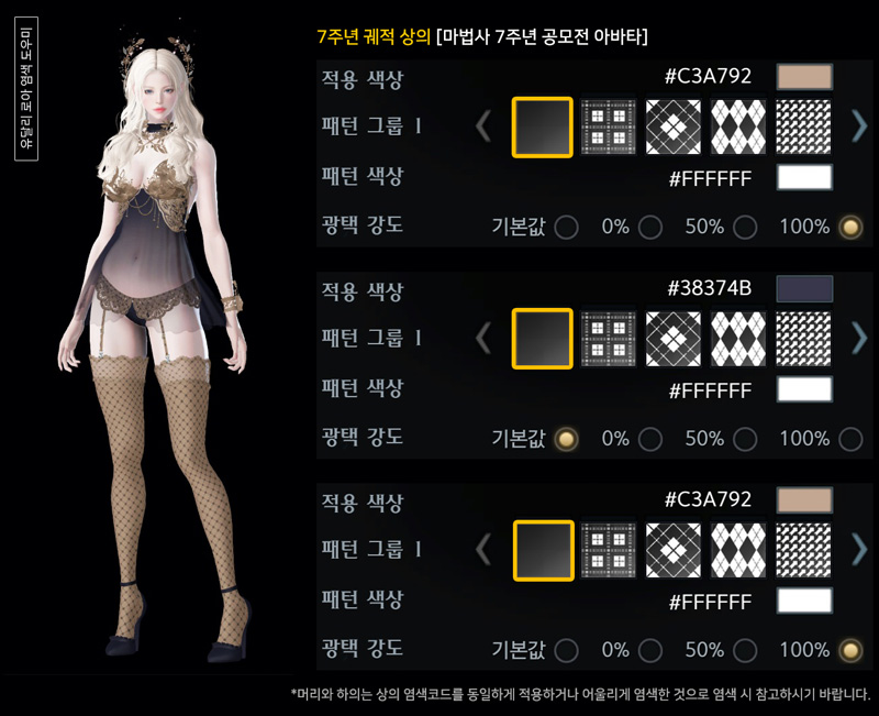 촬영 시 대륙 조명에 따라 아바타에 적용된 염색, 패턴, 광택이 다르게 보일 수 있으니 참고 바랍니다.