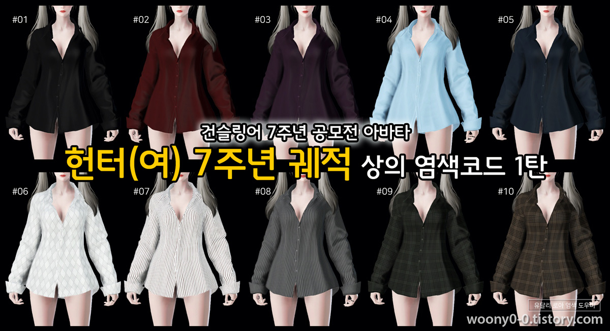 7주년 건슬링어 궤적 아바타 염색코드 2탄안녕하세요. 유달리입니다.오늘은 헌터(여) 건슬링어 7주년 궤적 아바타 염색코드 2탄을 준비했습니다. 공대생 남친셔츠 느낌을 주고싶어서체크무늬를