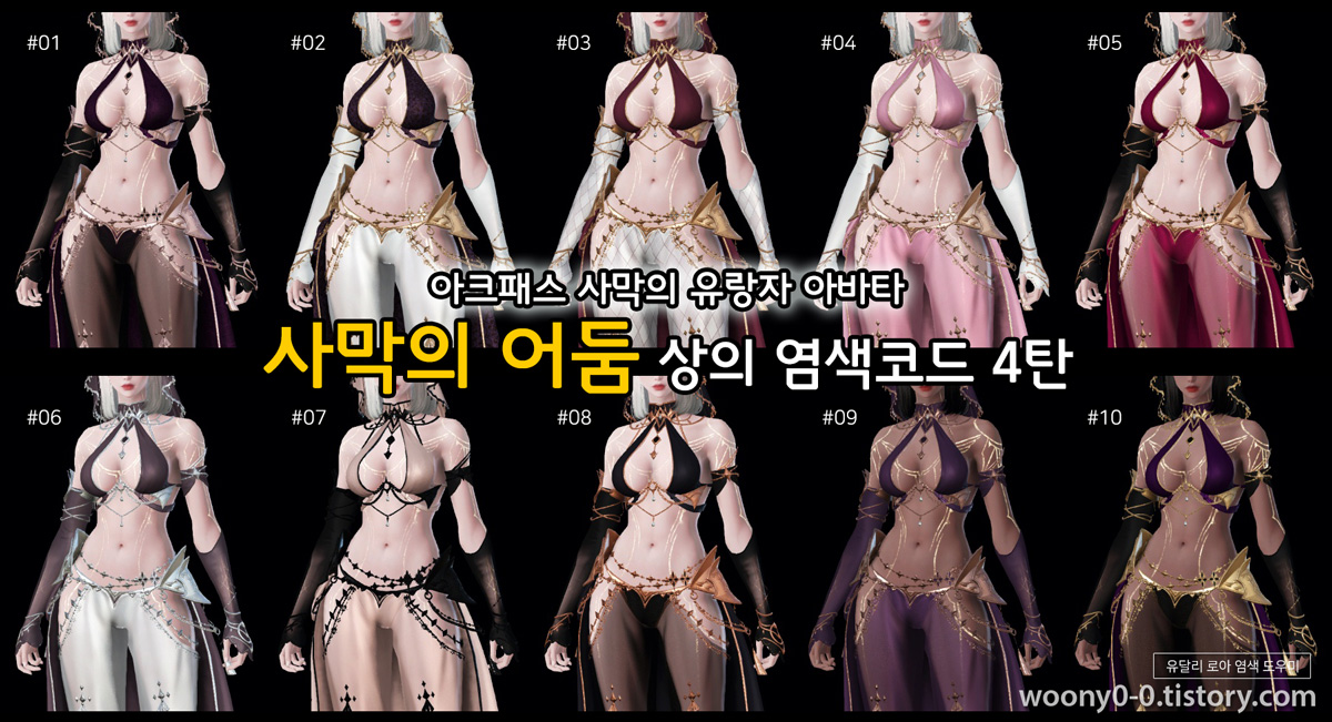 아크패스 사막의 어둠 아바타 염색코드 5탄안녕하세요. 유달리입니다.오늘은 아크패스 아바타로 출시된 사막의 유랑자 아바타 중[사막의 어둠] 아바타 상의 염색코드 5탄입니다.마지막탄입니다