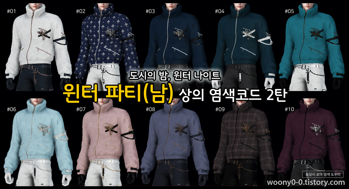 윈터 파티(남) 아바타 염색코드 4탄안녕하세요. 유달리입니다.오늘은 윈터 파티(남) 아바타 염색코드 마지막 4탄입니다.4탄에서는 가장 기본색상인 검은색, 흰색, 회색을 활용한 10종입니다. 퍼